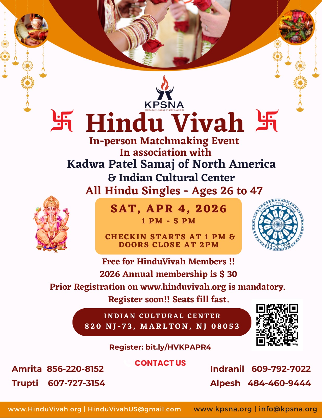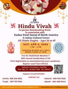 April 4, In- Person Event for ALL Hindu Singles, Ages 26–47, 1 PM – 5 PM, New Jersey
