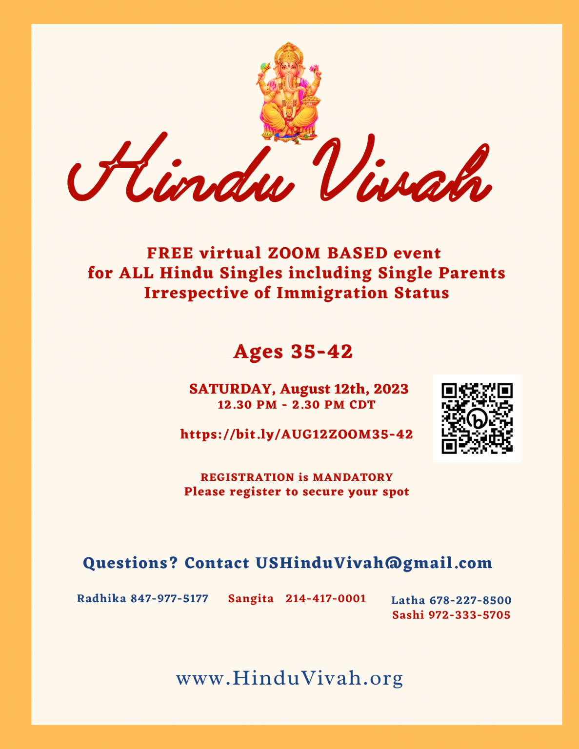 FREE virtual ZOOM BASED event for ALL Hindu Singles including Single Parents Irrespective of Immigration Status on Aug 12, 2023