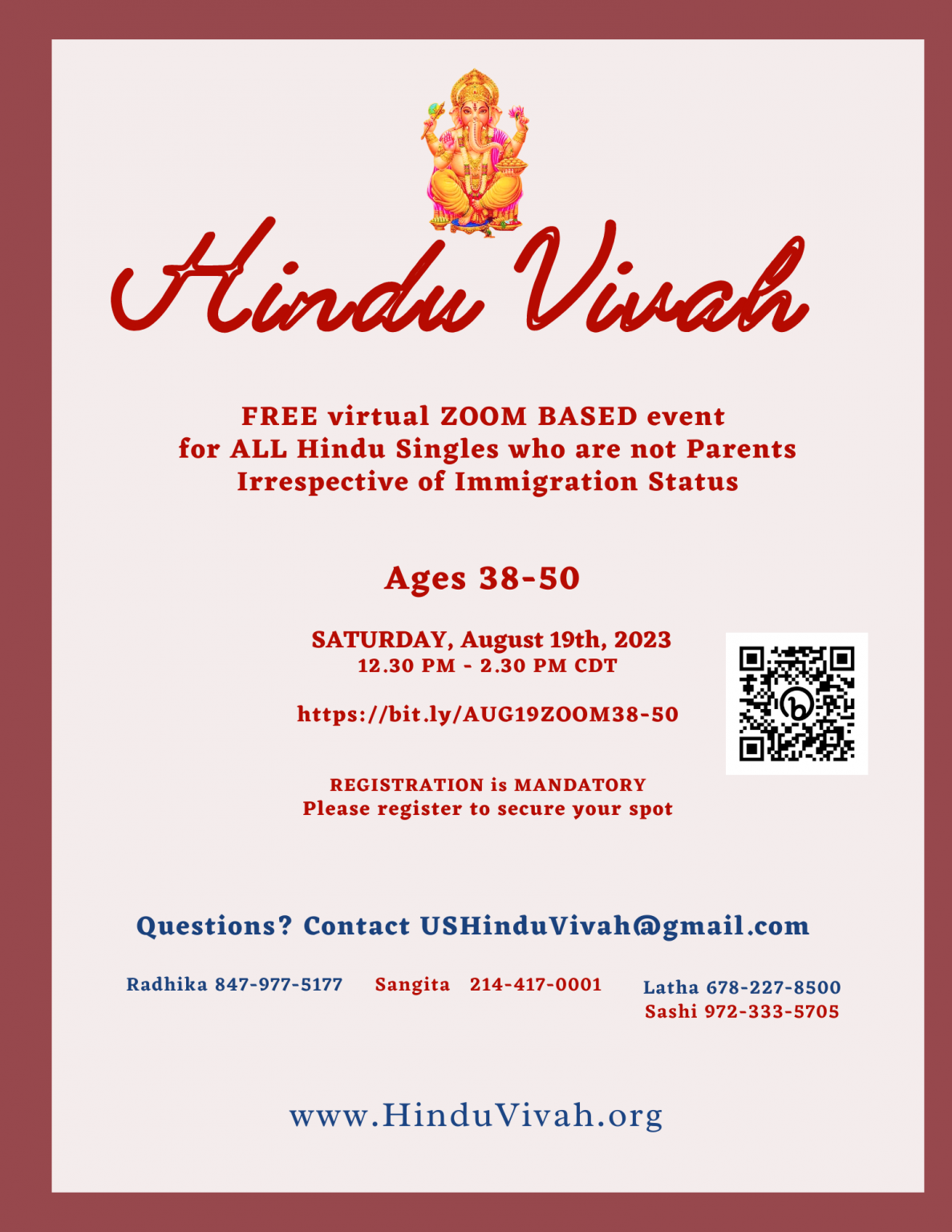 FREE virtual ZOOM BASED event for ALL Hindu Singles who are not Parents Irrespective of Immigration Status on Aug 19th, 2023
