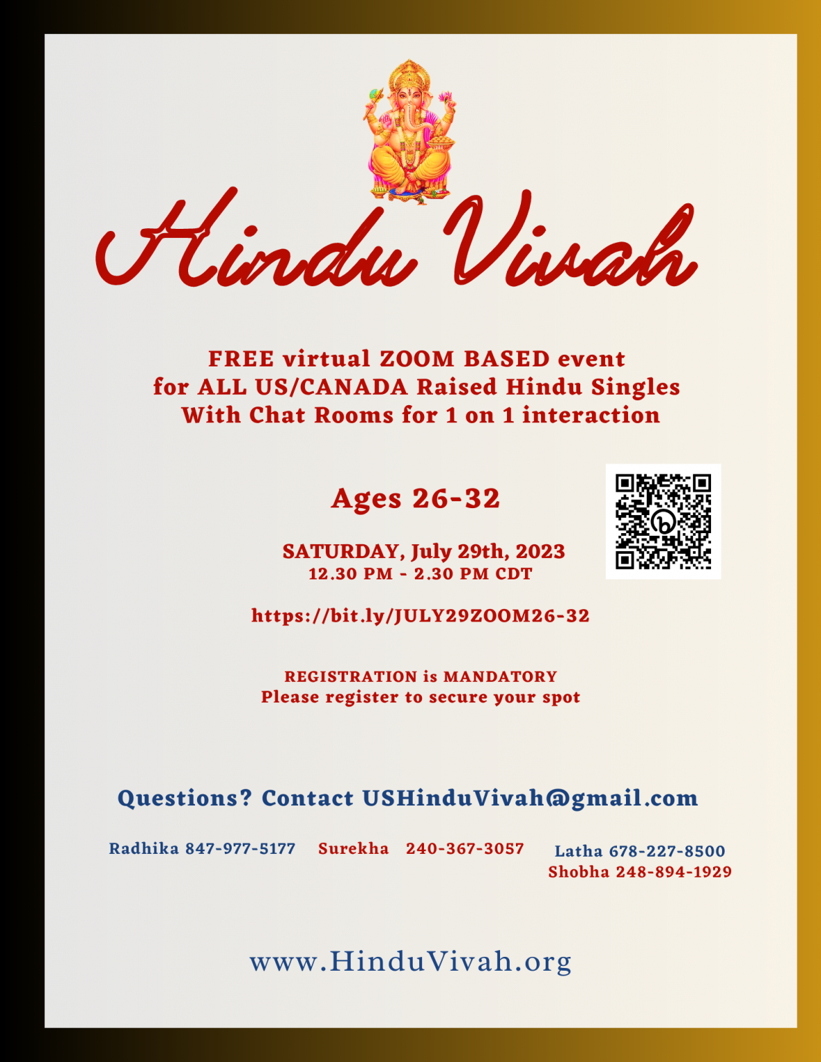 FREE virtual ZOOM BASED event for ALL US/CANADA Raised Hindu Singles on July 29th, 2023 for Ages 26-32