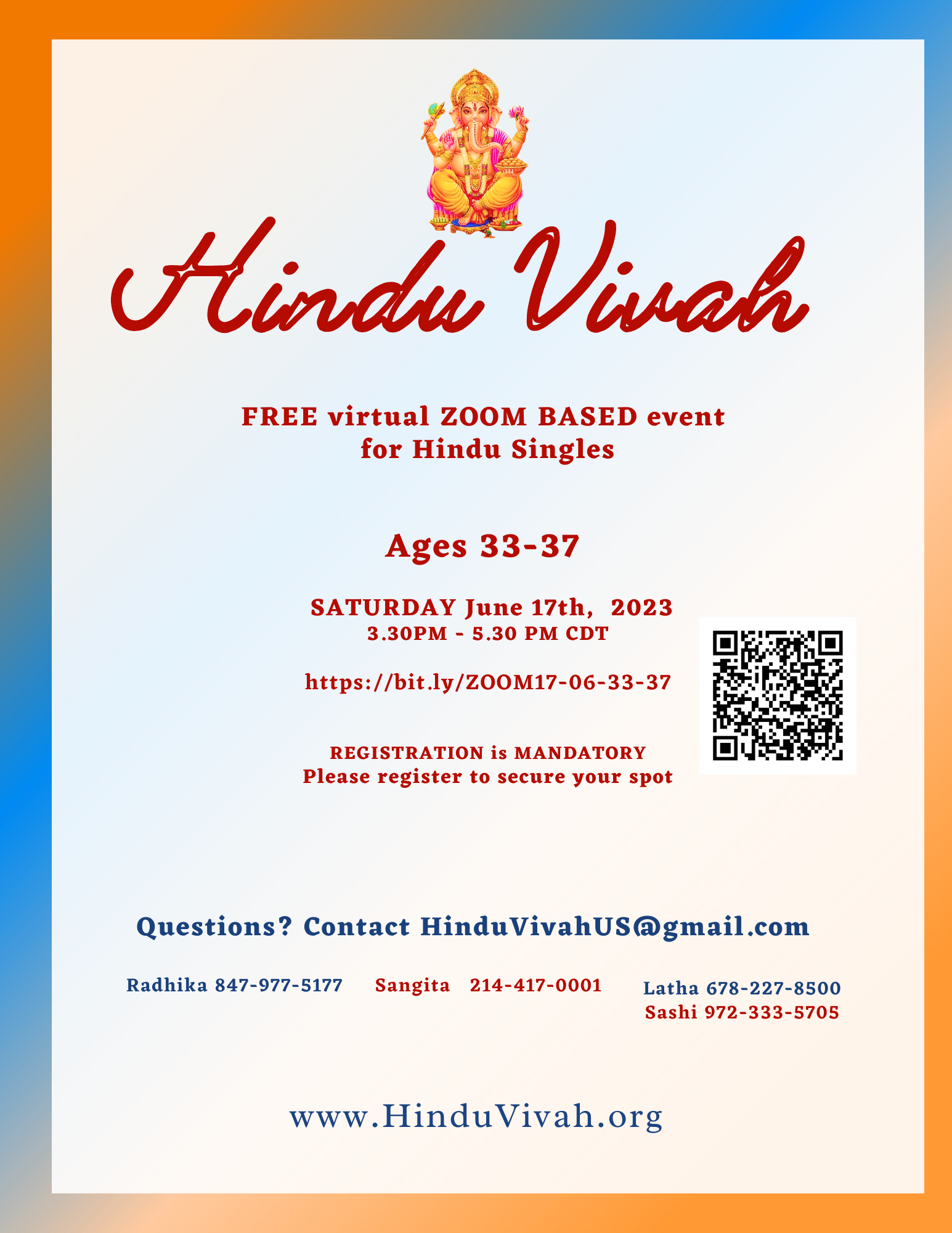 Free Virtual Zoom Based event for Hindu Singles Ages 33-37, June 17th, 2023