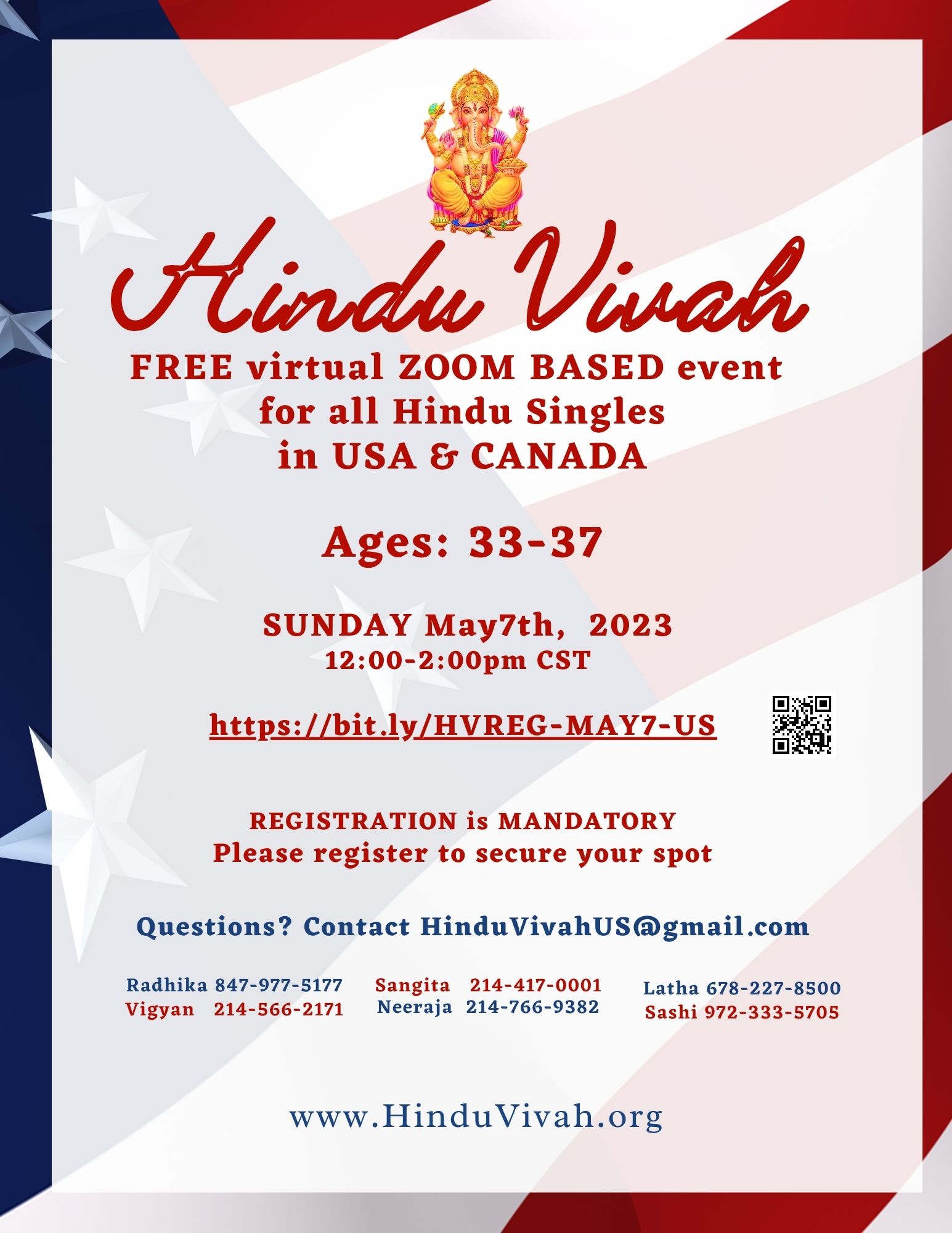 Free Virtual Zoom Based event for Hindu Singles in USA & Canada Ages 33-37 on May 7th 2023