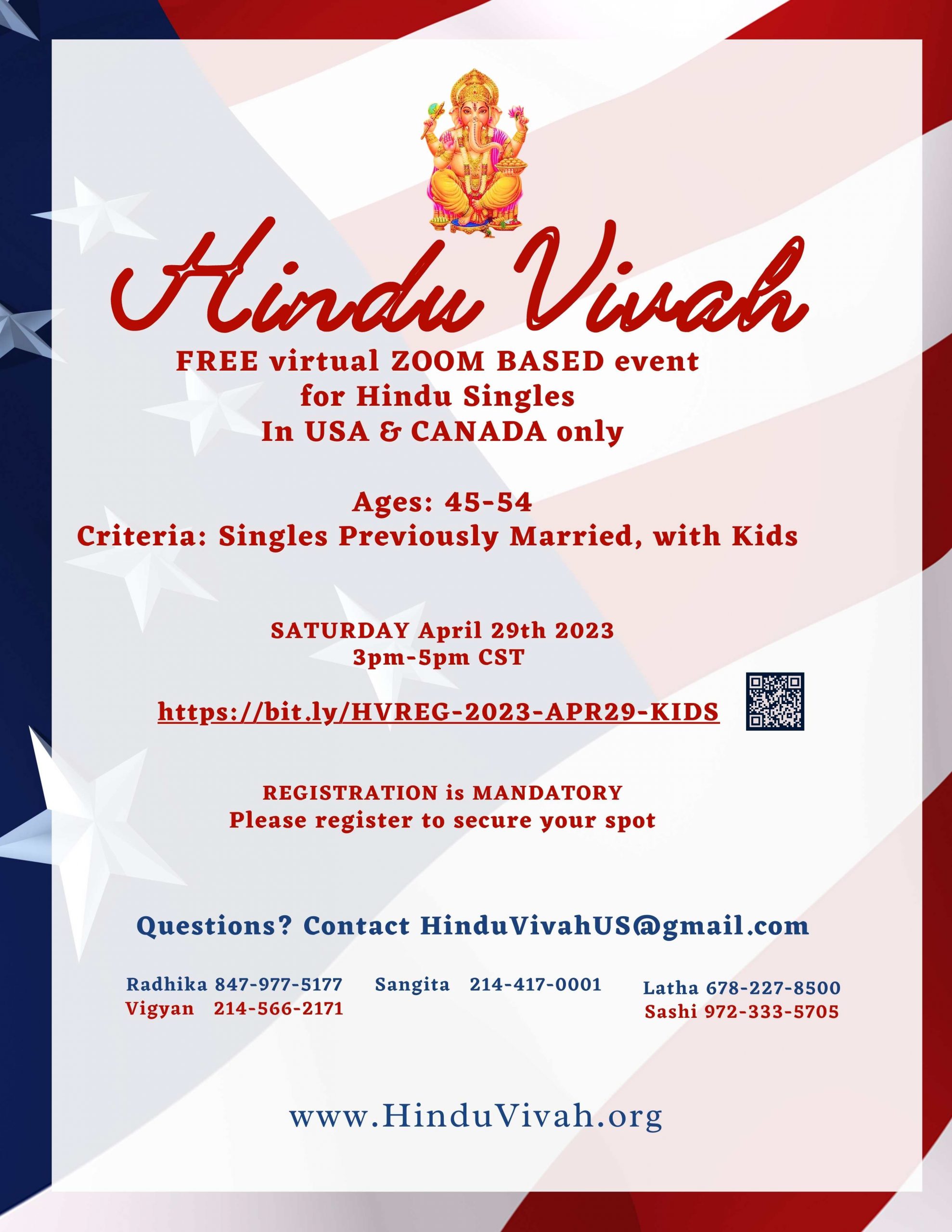 Free Virtual Zoom Based Event for Hindu Singles in USA & Canada for Ages: 45-54 April 29th, 2023