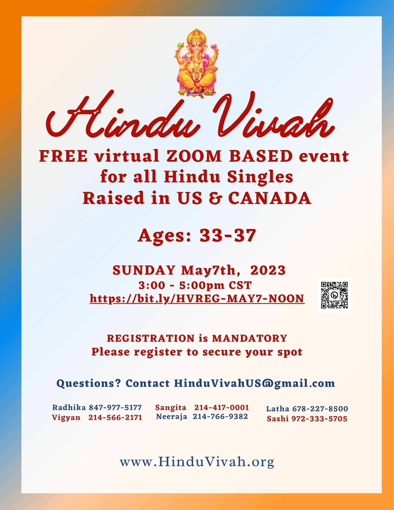 Free Virtual Zoom Based event for Hindu Singles Raised in US & Canada Ages 33-37 May 7th, 2023