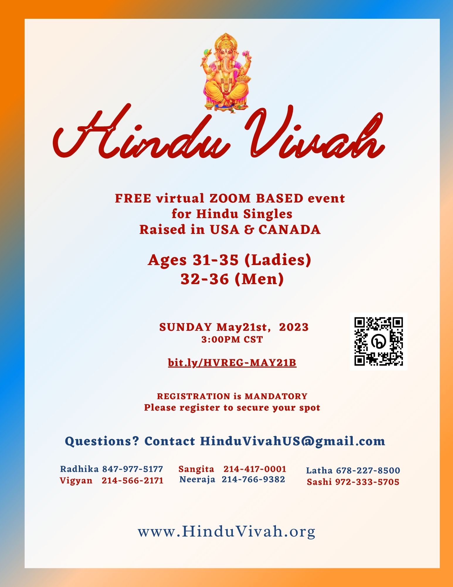 Free Virtual Zoom Based event for Hindu Singles Raised in USA & Canada Ages 31-36 May 21st, 2023