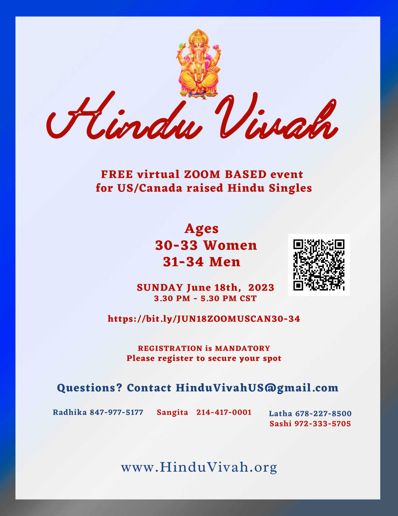 Free Virtual Zoom Based event for US & Canada raised Hindu Singles June 18, 2023