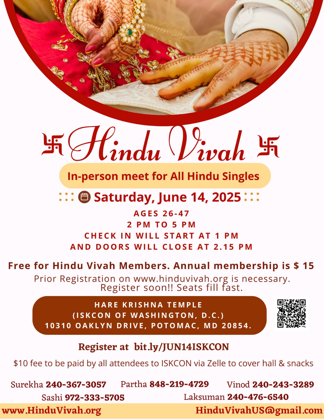 In-person Event for All Hindu Singles, Ages 26–47, 2 PM – 5 PM, ISKCON, Maryland