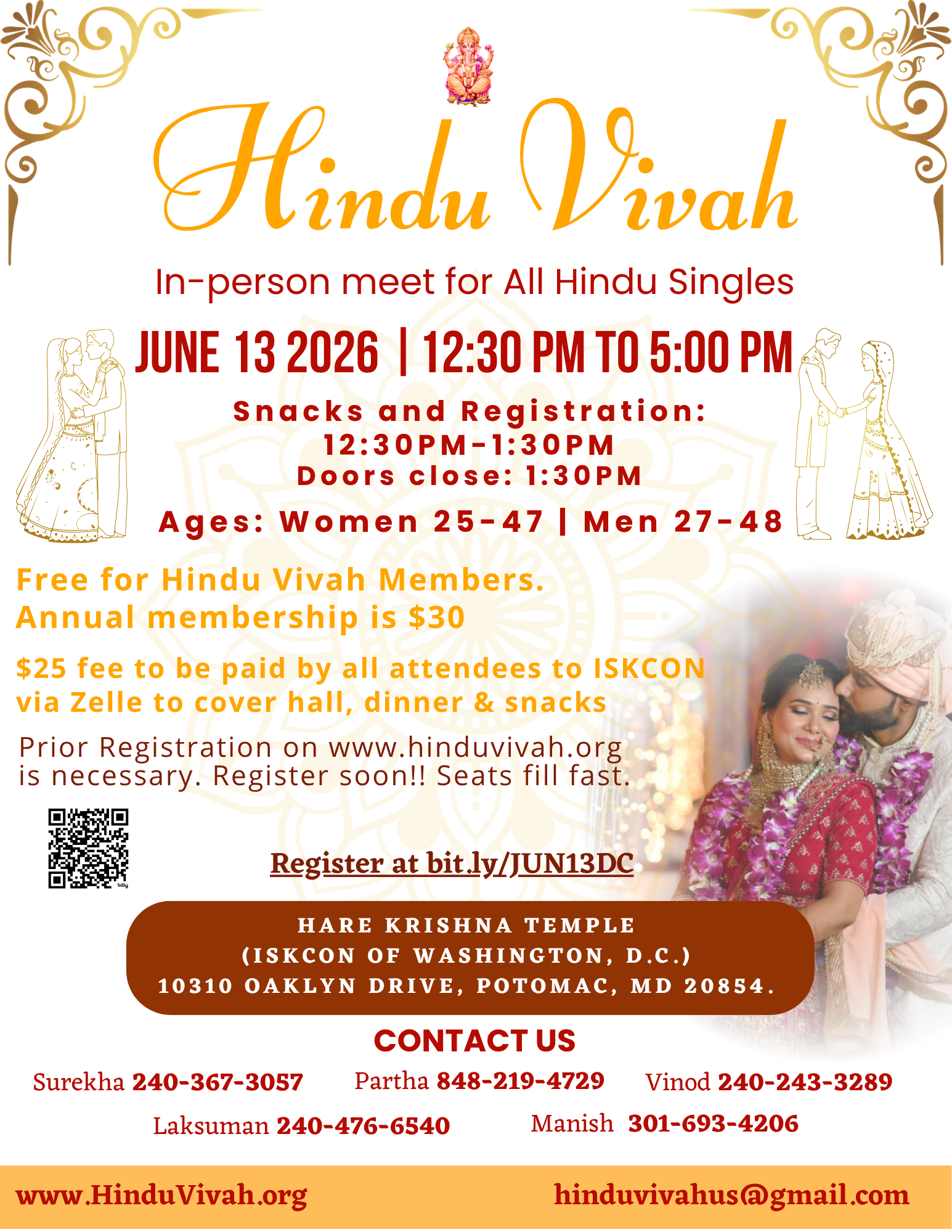 June 13 – In-Person Event ISKCON Temple, DC | Ages 26 – 48 | 12:30 PM – 5 PM Central Time