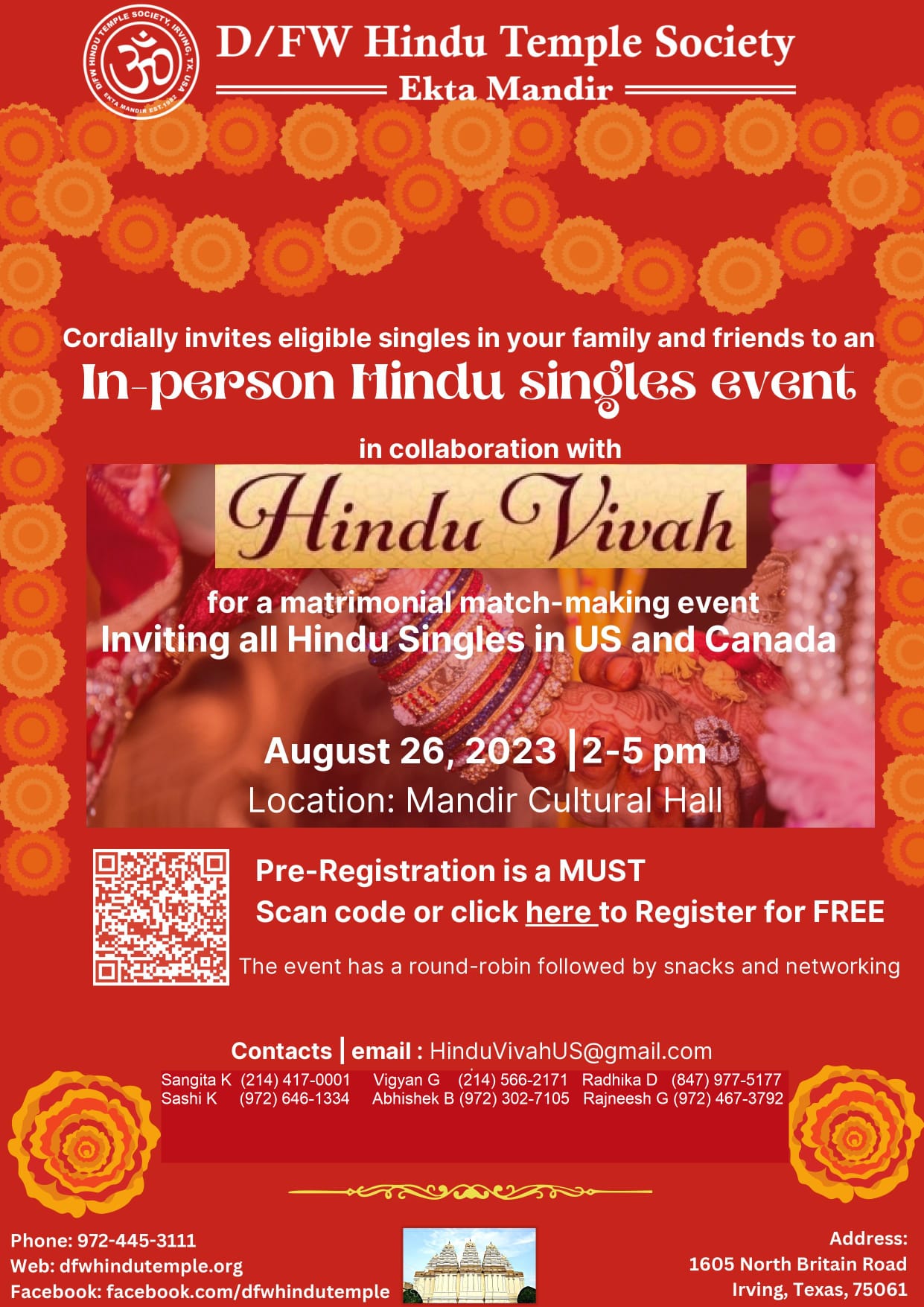 Inviting all Hindu Singles in US & Canada for a Matrimonial Match-Making Event Aug 26,2023