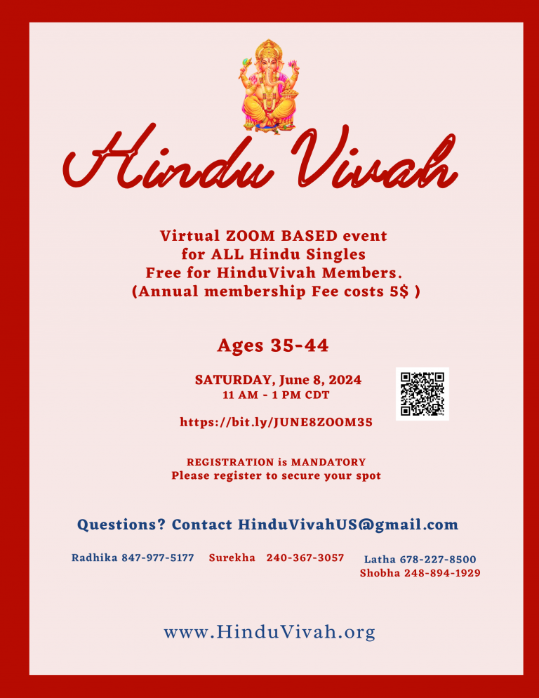 Virtual ZOOM BASED event for ALL Hindu Singles Age 35-44 on Jul 8, 2024