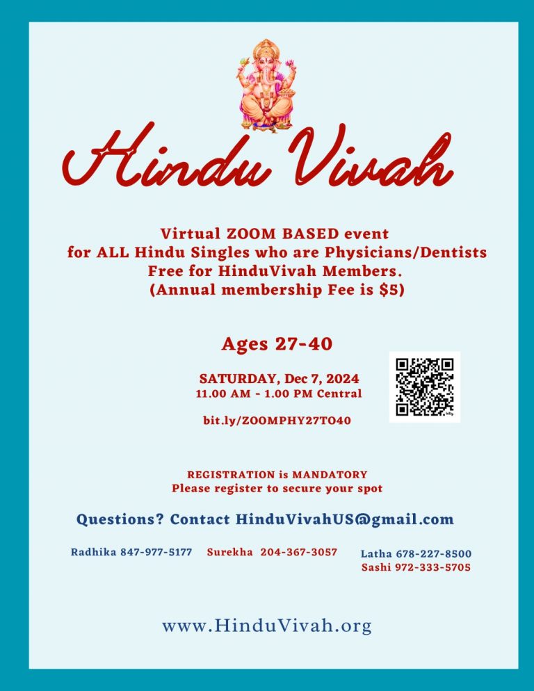 Virtual ZOOM BASED event for ALL Hindu Singles who are Physicians/Dentists Free for Hindu Vivah Members 2024