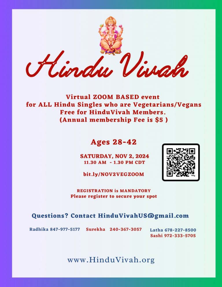 Virtual ZOOM BASED event for ALL Hindu Singles who are Vegetarians/Vegans Free for HinduVivah Members 2024