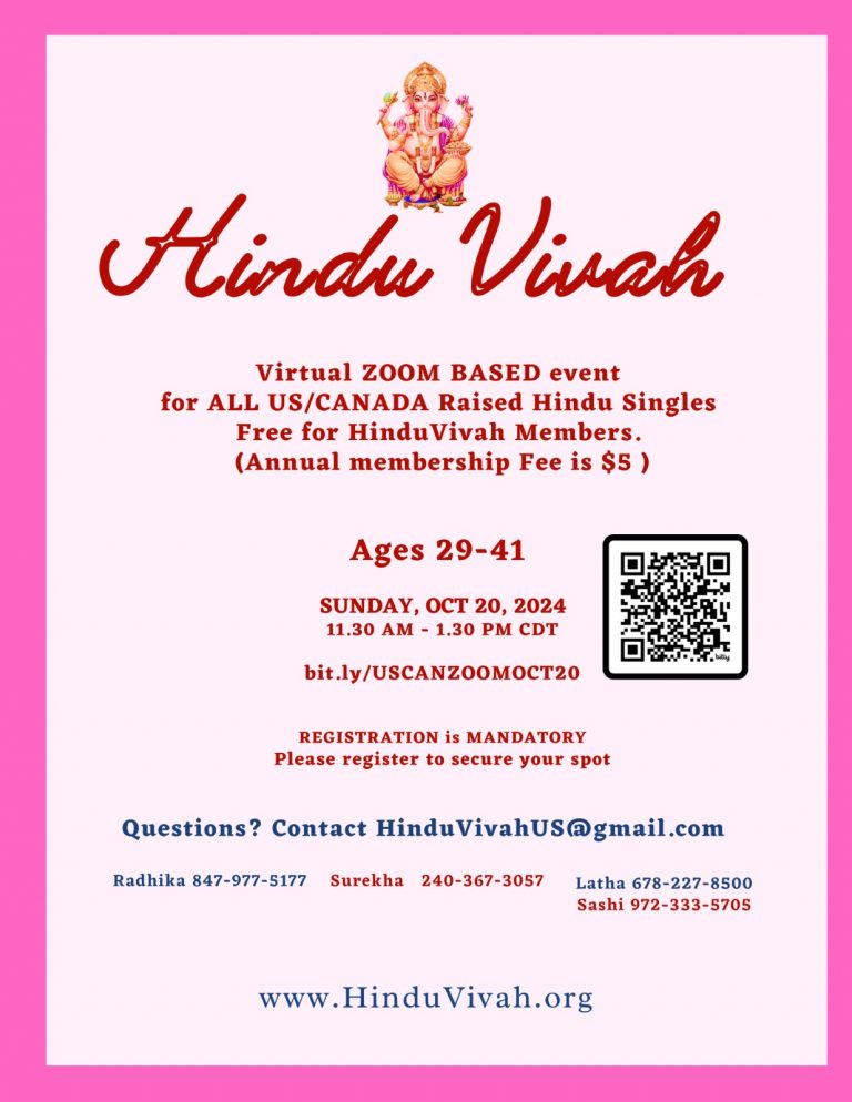 Virtual ZOOM BASED event for ALL US/CANADA Raised Hindu Singles Free for Hindu Vivah Members on Oct 20, 2024