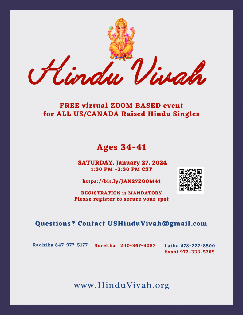 ZOOM BASED EVENT FOR US/CANADA RAISED HINDU SINGLES AGED 34-41 ON JANUARY 27, 2024
