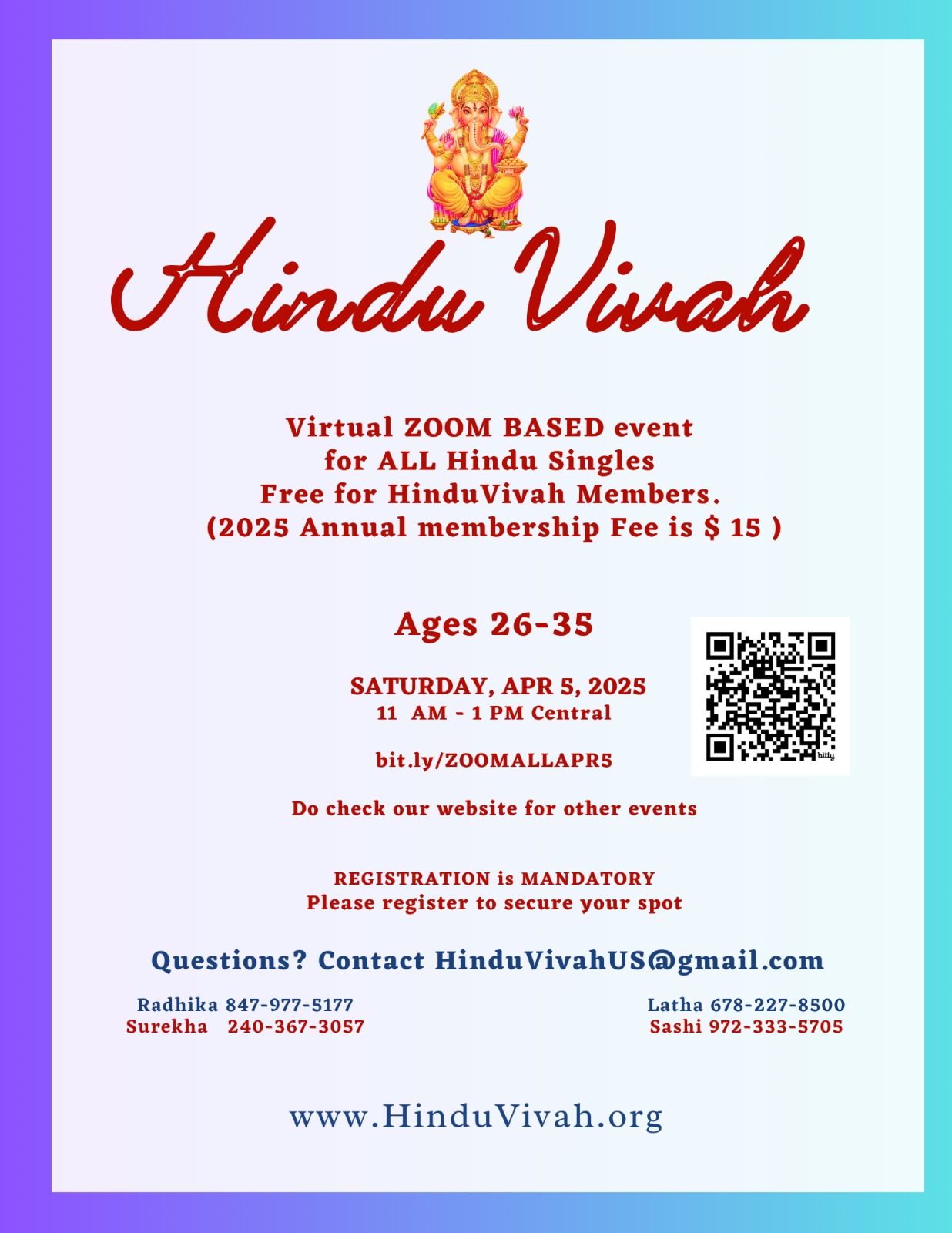 ZOOM EVENT FOR ALL HINDU SINGLES, AGES 26-35, 11 Am -1 pm CENTRAL APR 5,2025