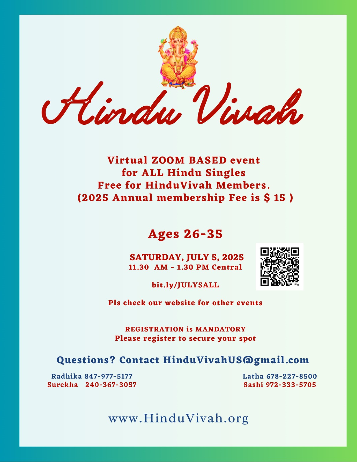 Zoom Event for All Hindu Singles, Ages 26–35, 11:30 AM – 1:30 PM Central