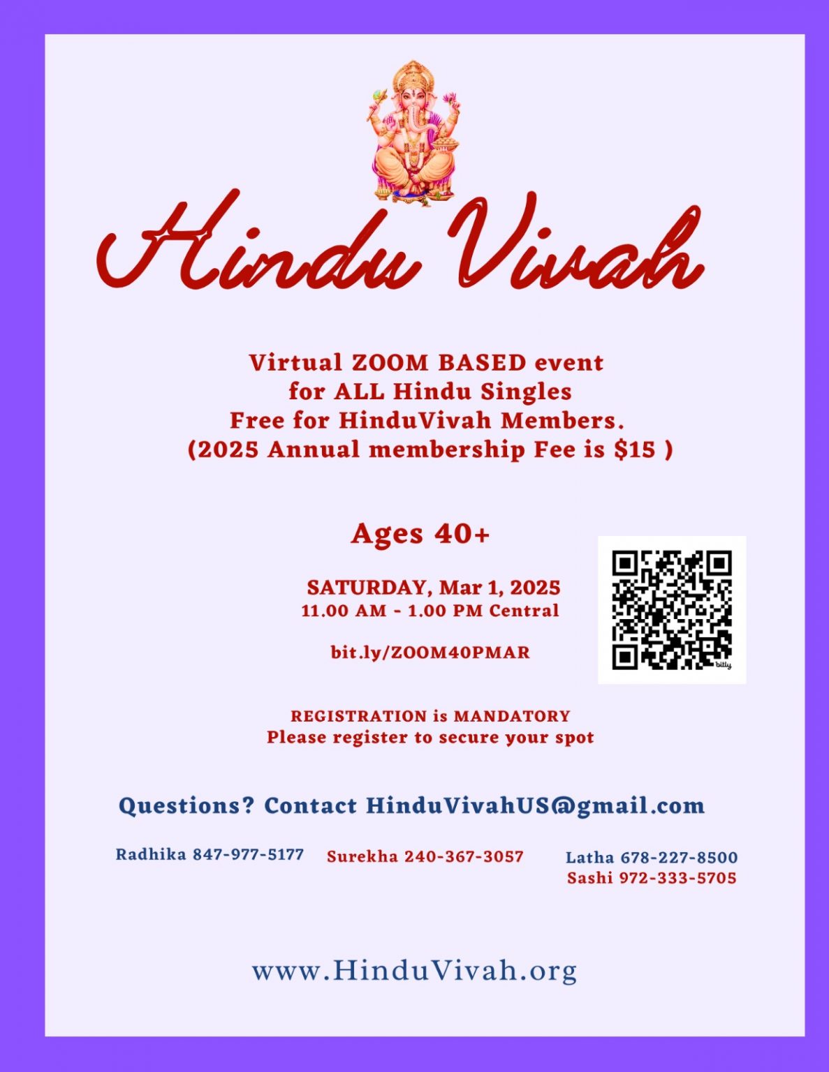 Zoom EVENT FOR ALL HINDU SINGLES, AGES 40+, 11AM -1PM MARCH 1, 2025