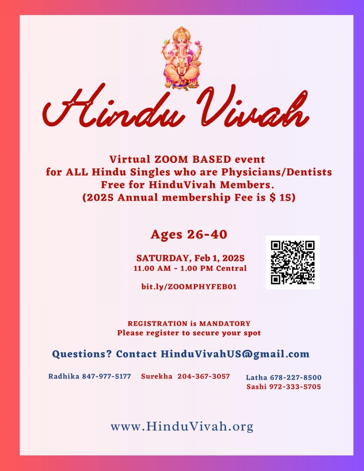 Zoom EVENT FOR ALL HINDU SINGLES, WHO ARE PHYSICIANS/DENTISTS, AGES 26-40, 11 am-1 pm CENTRAL. FEB 1, 2025