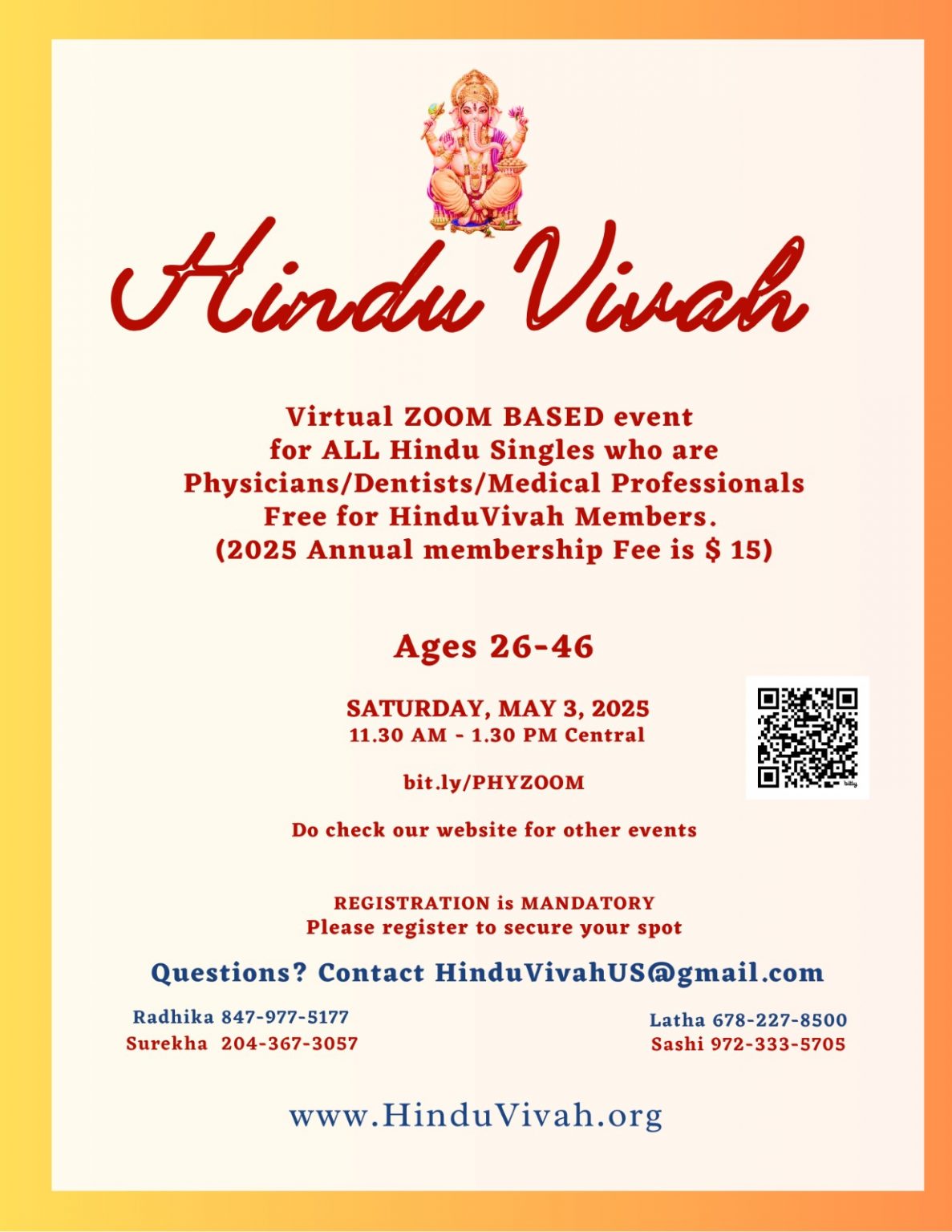 Zoom event for All Hindu Singles who are Physicians/ Dentists/ Medical Professionals, Ages 26-46, 11.30 Am -1.30 pm Central